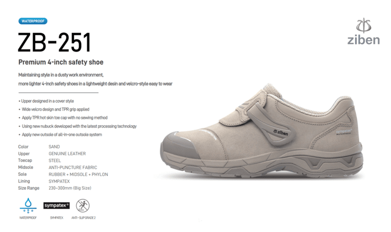 Ziben là một nhà máy sản xuất giày bảo hộ lao động số một tại Hàn Quốc, Giày bảo hộ Ziben 251 là một trong các mã sản phẩm cao cấp của hãng. Lĩnh vực kinh doanh chính của Ziben là sản xuất và phân phối Giày bảo hộ cao cấp, ngoài ra Ziben còn có nhà máy riêng chuyên về đồng phục, các sản phẩm của thương hiệu Ziben được định vị là sản phẩm cao cấp, kiểu dáng thời trang nhưng chức năng bảo hộ vượt trội so với các sản phẩm cùng ngành trên thị trường. Ziben áp dụng công nghệ tiên tiến nhất thế giới, và điểm đặc biệt nhất của giày Ziben chính là công nghệ chống thấm nước SYMPATEX (Đức), chống nước 100% nhưng vẫn đảm bảo thoáng khí. Sympatex là tập đoàn của Đức có chi nhánh tại 25 quốc gia trên thế giới. Ngoài ra, đa số giày Ziben sử dụng hệ thống khóa xoay, rất tiện lợi khi sử dụng giày (mang vào/ cởi ra). Vật liệu làm nên đôi giày Ziben củng rất đặc biệt, ngoài nhưng vật liệu cơ bản trong nước, thì các vật liệu đặc chủng được nhập khẩu từ các nước có nền sản xuất và công nghệ tiên tiến như Đức, Hàn Quốc…