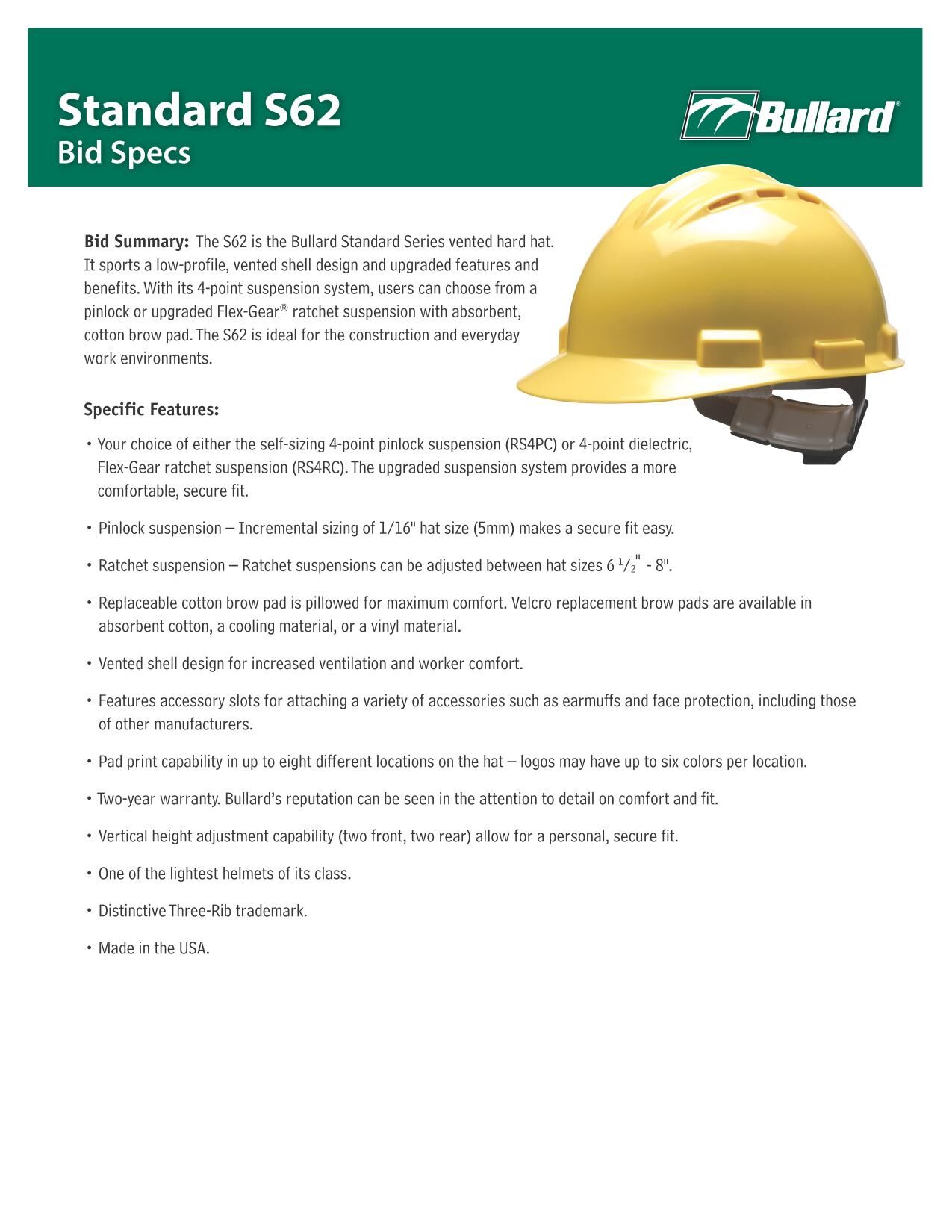 Nón (mũ) bảo hộ lao động Bullard S62 là dòng nón thuộc dòng Standard Series của nhãn hiệu Bullard – Mỹ. Các dòng sản phẩm nón bảo hộ của thương hiệu Bullard – Mỹ được sử dụng rộng rãi tại thị trường dịch vụ, công nghiệp và chữa cháy. Người dùng sẽ tìm thấy sự thoải mái và bảo vệ với phong cách trong Seri Tiêu chuẩn này.