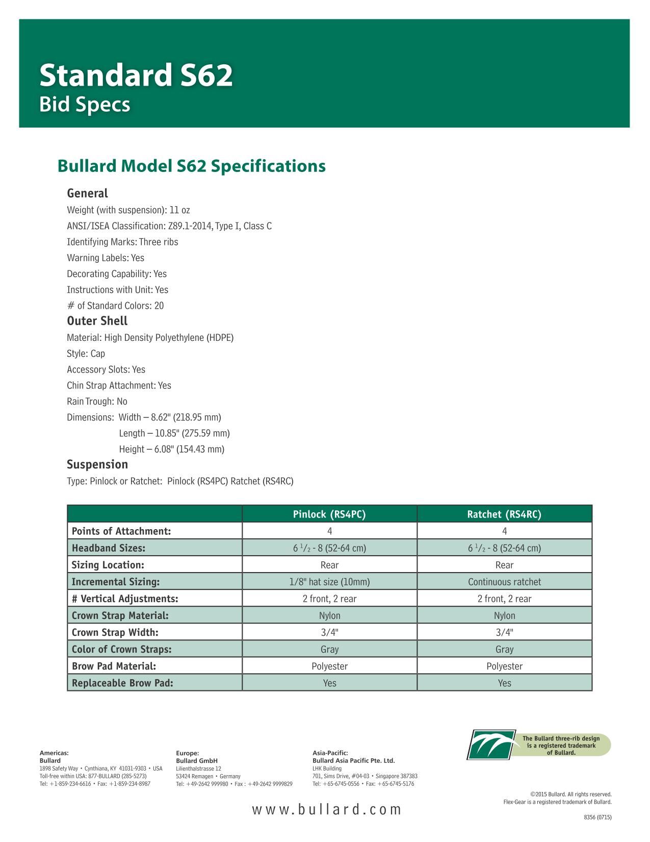 Thông số kỹ thuật của nón bảo hộ Bullard S62