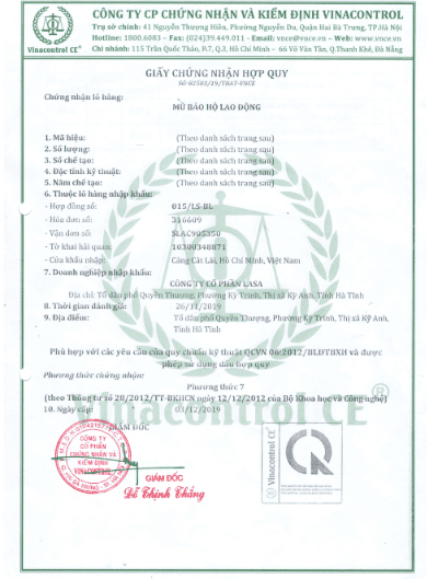 Sản phẩm nón bảo hộ Bullard có Giấy chứng nhận hợp quy đầy đủ