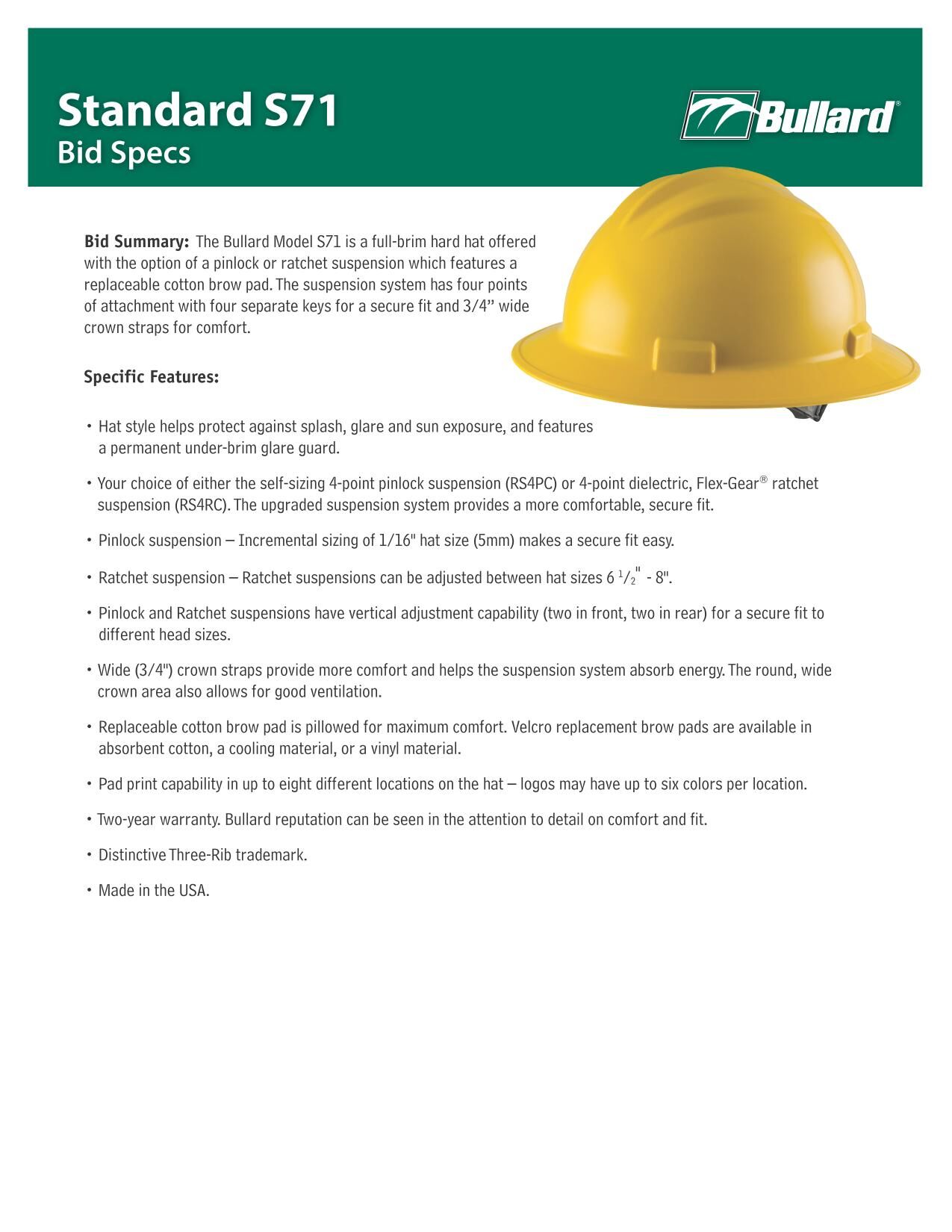 Nón (mũ) bảo hộ lao động Bullard S71 là dòng nón thuộc dòng Standard Series của nhãn hiệu Bullard – Mỹ. Các dòng sản phẩm nón bảo hộ của thương hiệu Bullard – Mỹ được sử dụng rộng rãi tại thị trường dịch vụ, công nghiệp và chữa cháy. Người dùng sẽ tìm thấy sự thoải mái và bảo vệ với phong cách trong Seri Tiêu chuẩn này.