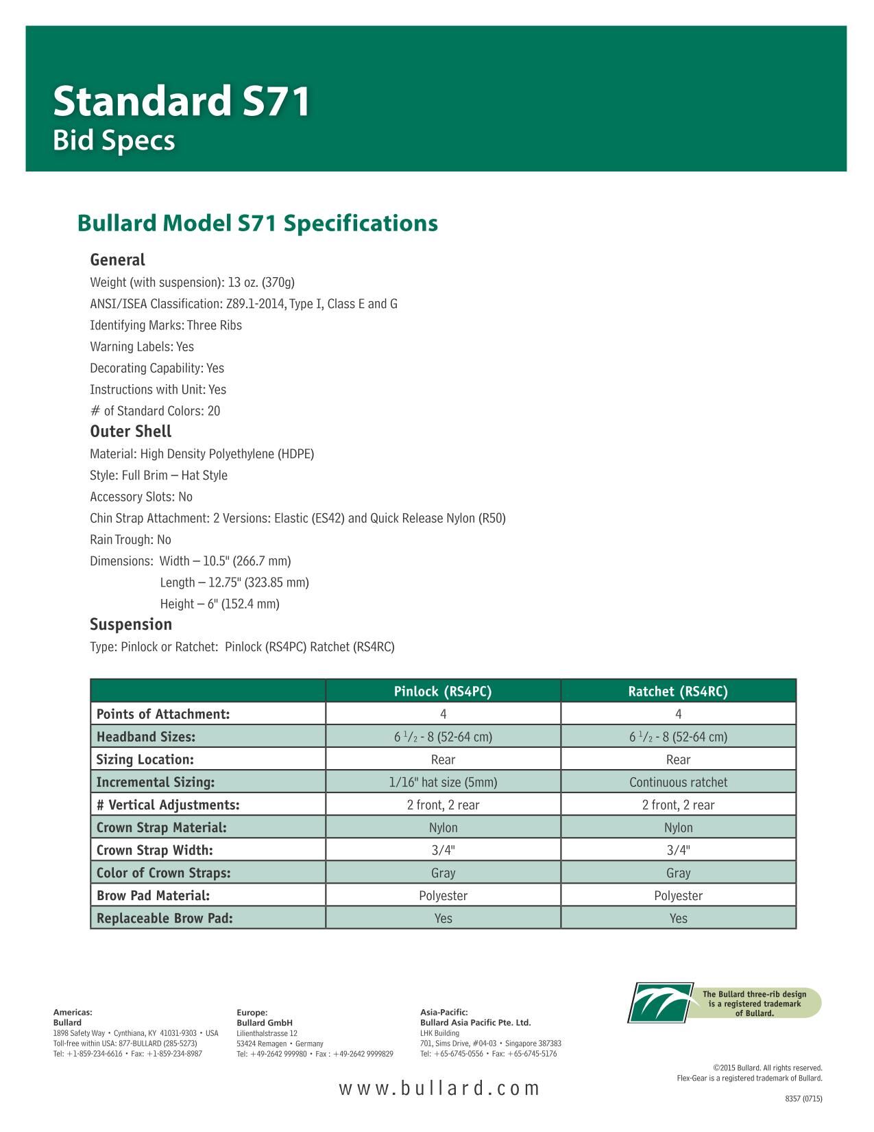 Thông số kỹ thuật của nón bảo hộ Bullard S71